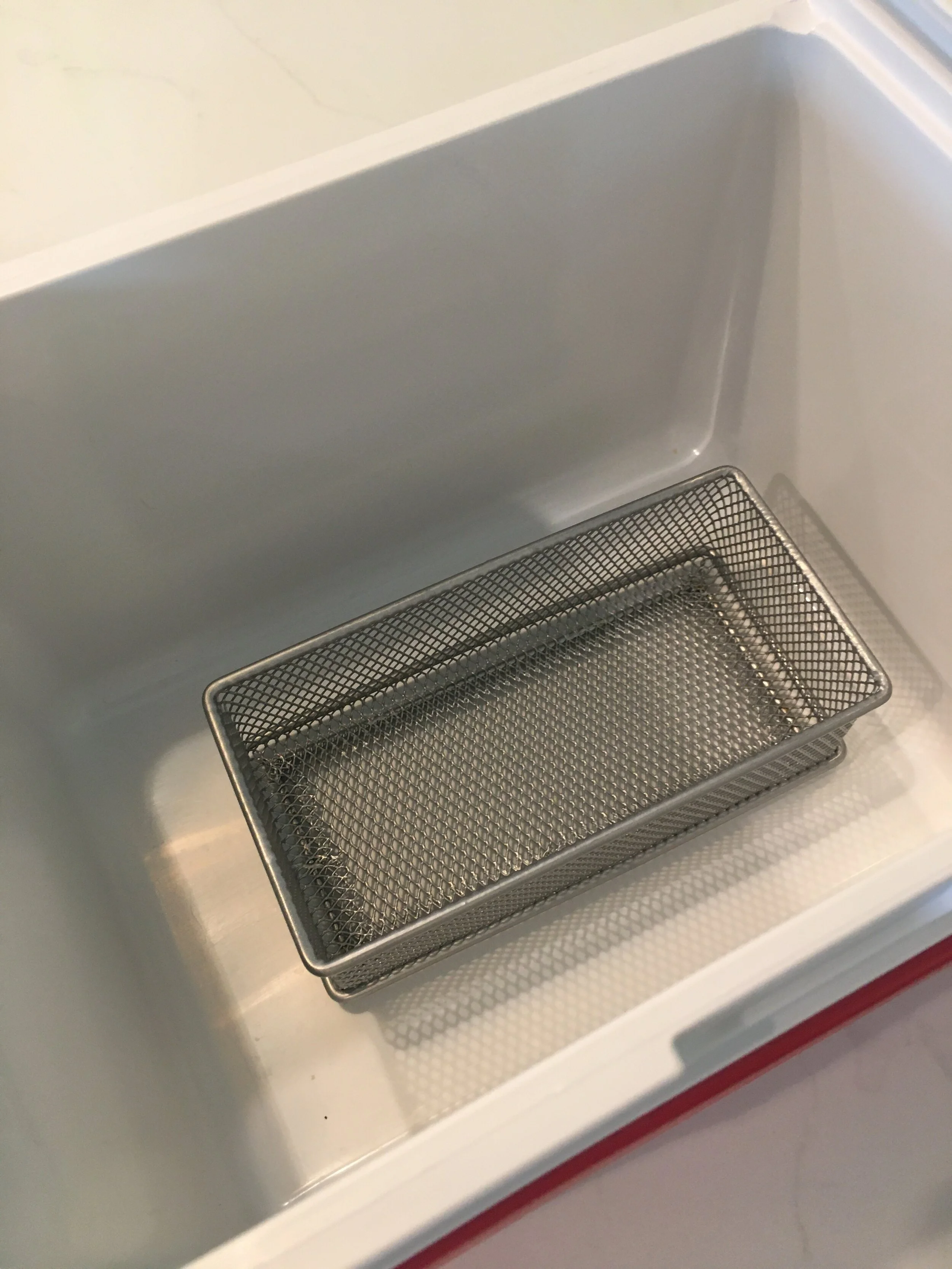 Mesh organizer-The one I have is from the container store, 3" x 6" x 2" h. size is important since it needs to fit in the cooler. you could also use pvc pipe, legos, anything to elevate the cube tray in the cooler.